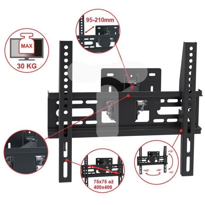 Otočný a sklopný držák na Tv 26-55", vzdálenost od zdi 95-240mm, robustní ocelová konstrukce, velká instalační nástěnná deska, VESA 75x75 až 400x400, nosnost 30kg.Více