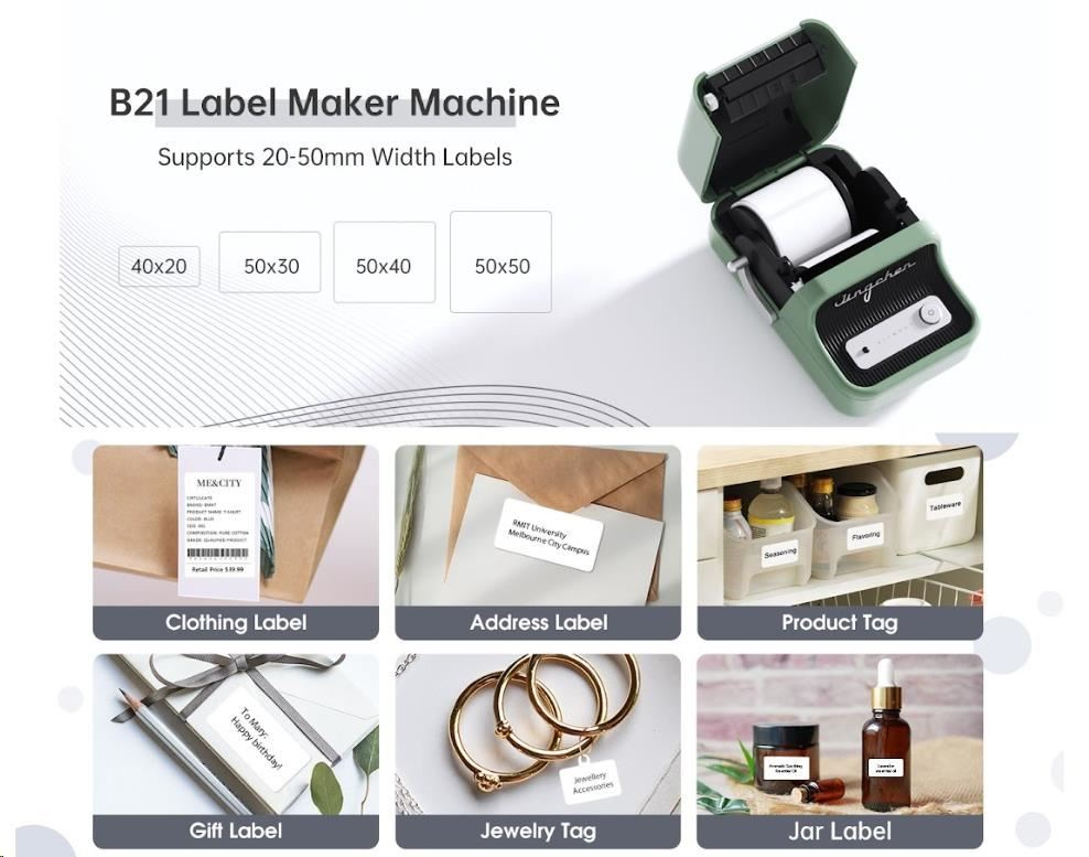 Popis Niimbot Tiskárna štítků B21S Smart, zelená + role štítků 210ks