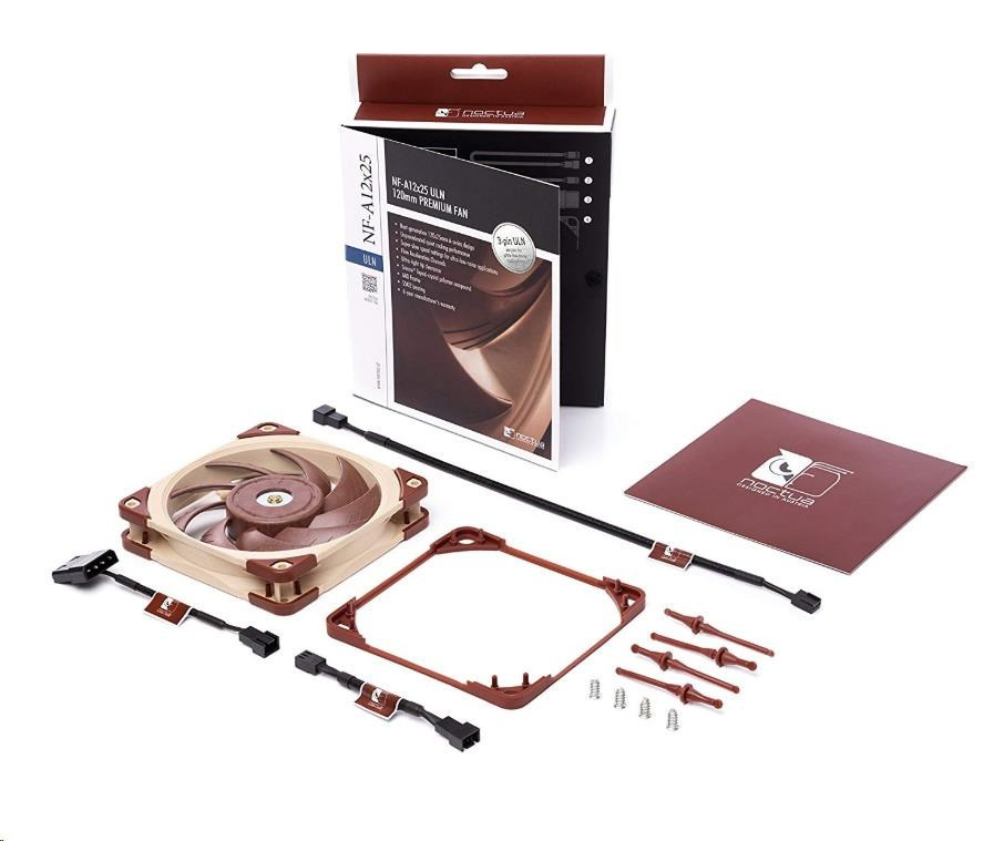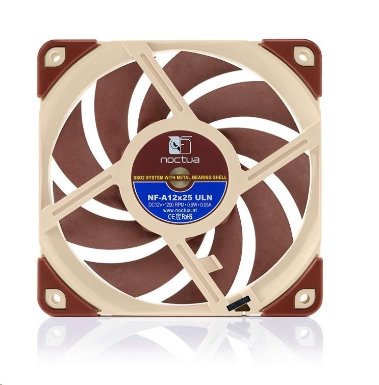 ventilátor, tichý, rozměry 120x120x25mm, max. hlučnost 12.4dBA, max. průtok 55.7 m3/h, 1200 ot./min, 3pin, ložiska SSO2