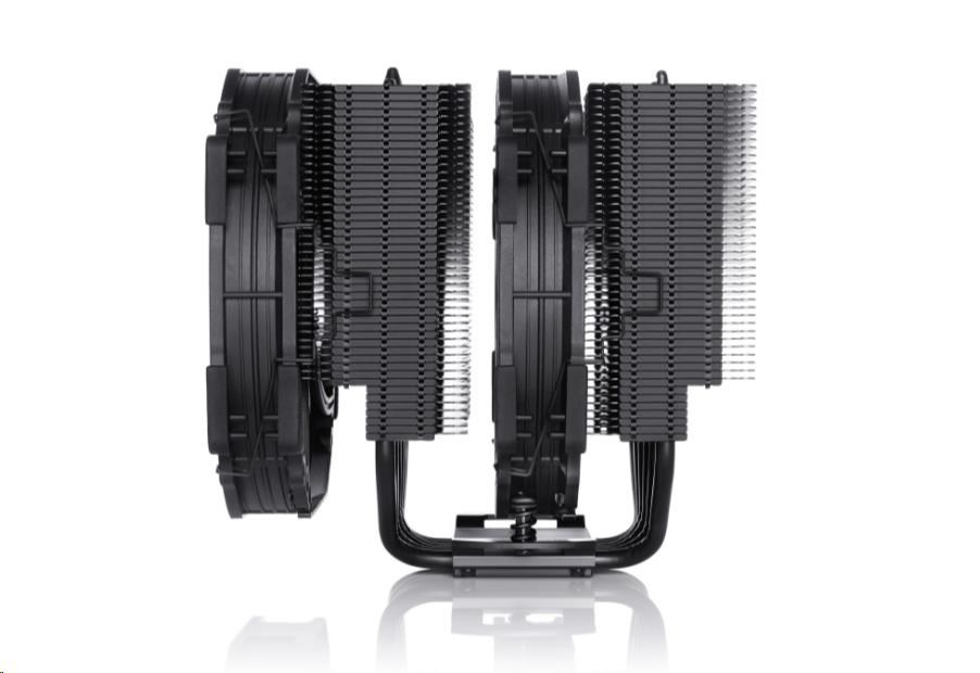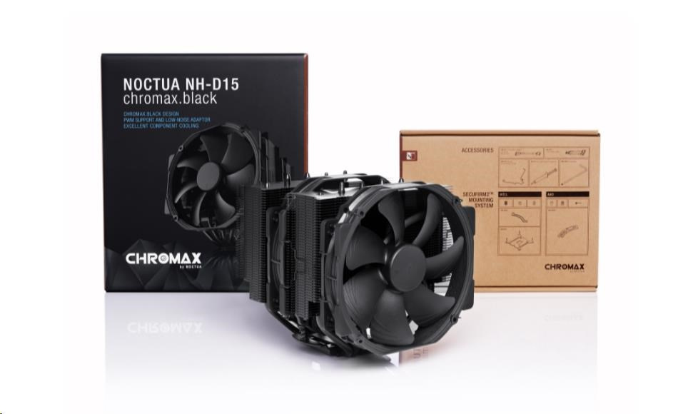 Akční nabídky na váš e-mailNH-D15 chromax.black je černá verze oceněného modelu NH-D15, špičkového tichého chladiče procesoru společnosti Noctua. Díky stejné osvědčené konstrukci chladiče dual-tower a ventilátorům NF-A15 PWM zůstává věrný úspěšnému NH-D15, který se vyrovná výkonu vodních chladičů typu all-in-one při zachování vynikajícího tichého provozu. Verze chromax.black s černými ventilátory a chladičem s černým povrchem zároveň kombinuje tyto přednosti s elegantním stealth vzhledem. NH-D15 chromax.black, doplněný o proslulý systém montáže SecuFirm2 do více socketů, tepelnou směs Noctua NT-H1 pro nadšence a plnou 6letou záruku výrobce, je luxusní volbou pro overclockery i tiché nadšence, kteří hledají chladič elitní třídy, který vypadá stejně skvěle jako chladí.