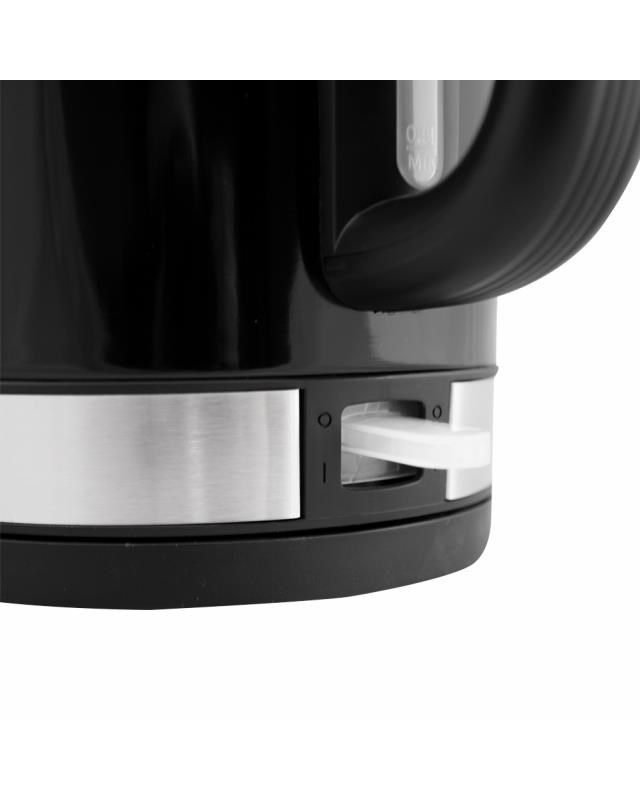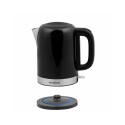 Automatická varná konvice, černá lesklá barva, Objem vody: max. 1,7 l, Napájení: 220 - 240V ~ 50/60 Hz, 1 850 - 2 200W, VDE zástrčka, Varná nádoba na odnímatelném 360 ° otočném podstavci, Topné těleso překryté deskou z ušlechtilé oceli, automatické vypnutí, Ochrana před ohřevem bez vody, ukazatel napájení, S indikátorem hladiny vody.