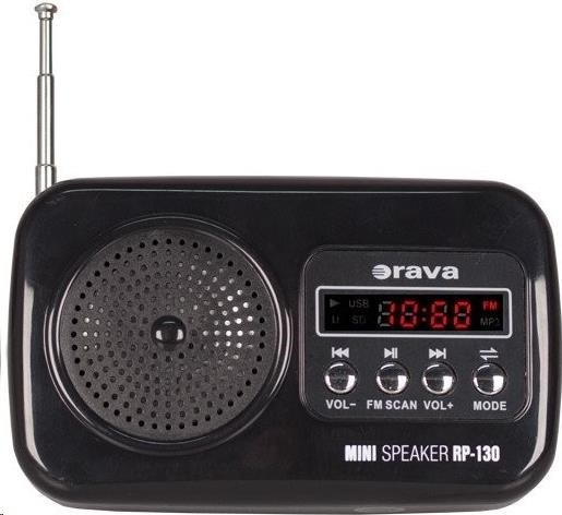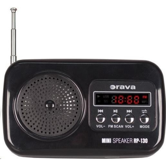 Popis Orava RP 130 přenosný rádiopřijímač, SD Karta, výstup na sluchátka, LED displej, FM rádio, USB, AUX vstup, černý