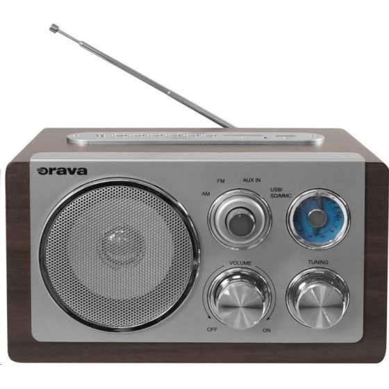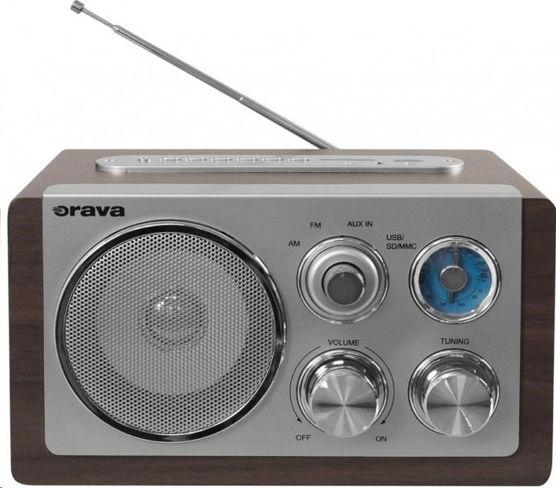 Popis Orava RR-29 A rádio, 1 x 3,5W, AM / FM rádio, USB, AUX vstup, SD karta, hnědá / stříbrná
