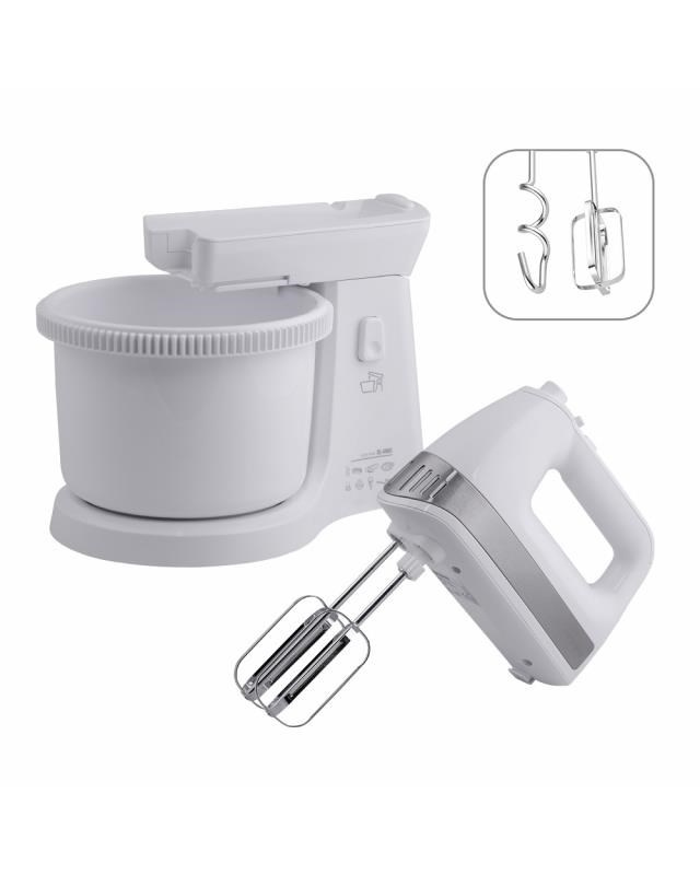 Elektrický ruční šlehač s otočnou nádobou, 5 rychlosti a funkce TURBO pro maximální výkon, 2,5 l otočná nádoba s mechanickým pohonem, Sada šlehacích metel a metel na hnětení, výklopné rameno, Napájení: 220 - 240V ~ 50 / 60Hz, 400 W.
