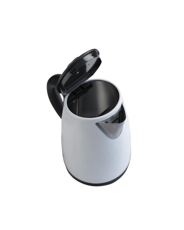 Elektrická varná konvice - bílá. Varná nádoba z ušlechtilé nerezové oceli. Objem 1,7l. Otevírání vrchního víka konvice stisknutím tlačítka. Varná nádoba na odnímatelném 360° otočném podstavci. Topné těleso překryté plotnou s ušlechtilé oceli. Stupnice hladiny vody. Ochrana před ohřevem bez vody. Auto vypnutí. Vyjímatelné filtrační sítko na vodu. Síťová šňůra odkladatelná v podstavci. Napájení 230V 50 Hz, 2000 W.