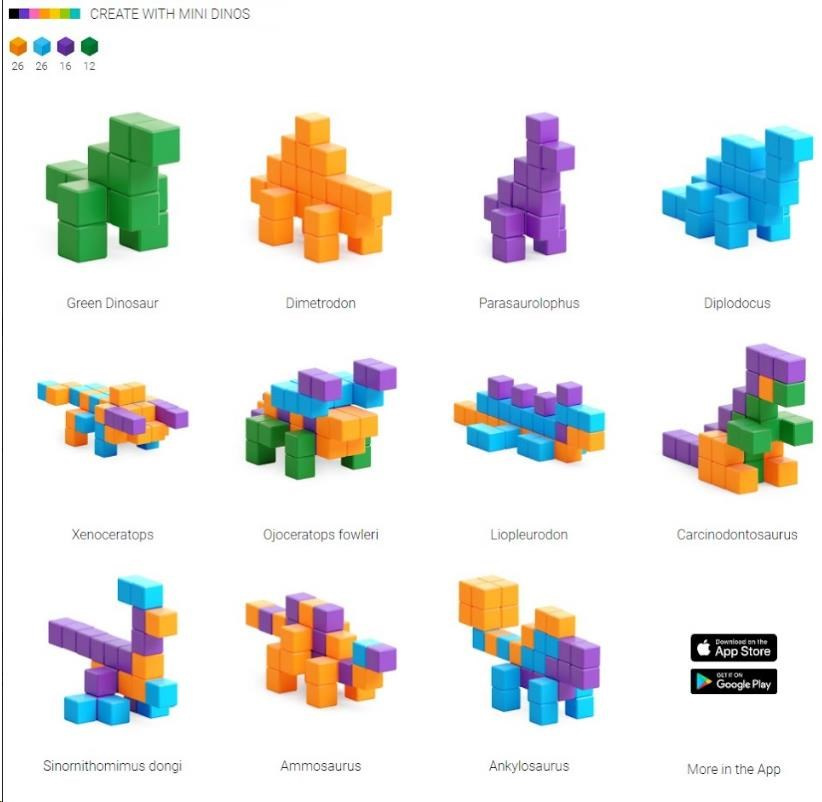 Akční nabídky na váš e-mailŘada PIXIO Mini Dinos obsahuje 80 bloků PIXIO ve 4 barvách. Umožní oživit vaše kreativní nápady a