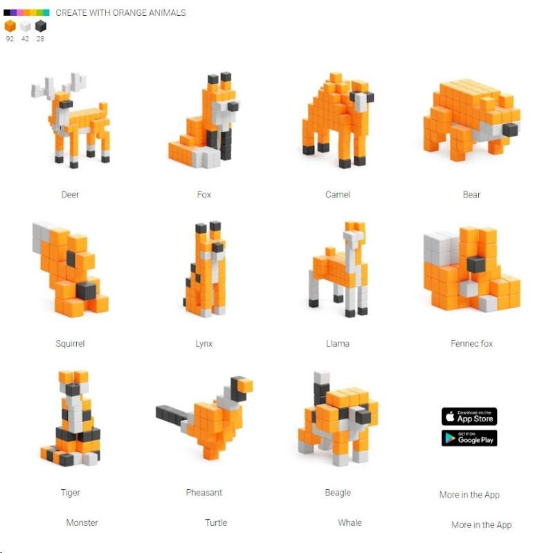 Akční nabídky na váš e-mailDESIGNOVÁ ŘADA PIXIO Orange Animals obsahuje 162 bloků PIXIO ve 3 barvách. Umožní oživit vaše