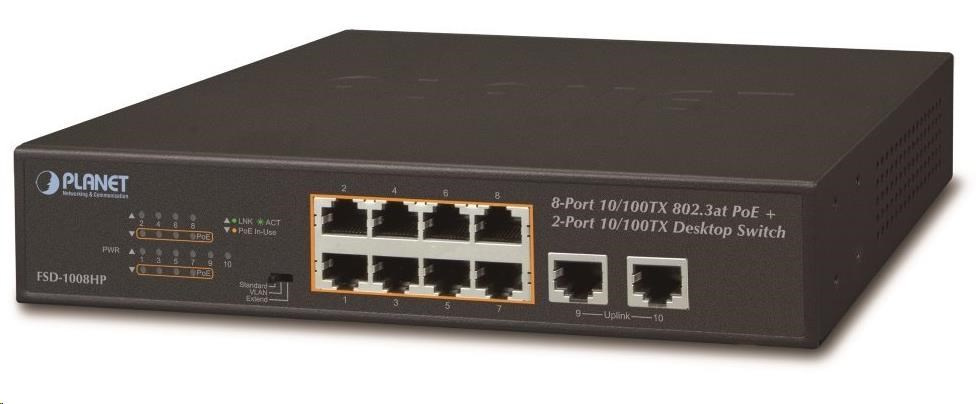 Nespravovaný přepínač vhodný pro CCTV kamerové IP systémy. Má malé rozměry, nízký příkon a možnost dále napájet Power over Ethernet koncová zařízení podle standardu IEEE 802.3at. Umožňuje připojit a napájet zařízení ethernet rychlostí 10Mb/s do vzdálenosti až 250m na klasické UTP kabeláži, jednotlivé porty s PoE napájením lze provozně oddělit portovými VLAN.