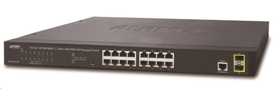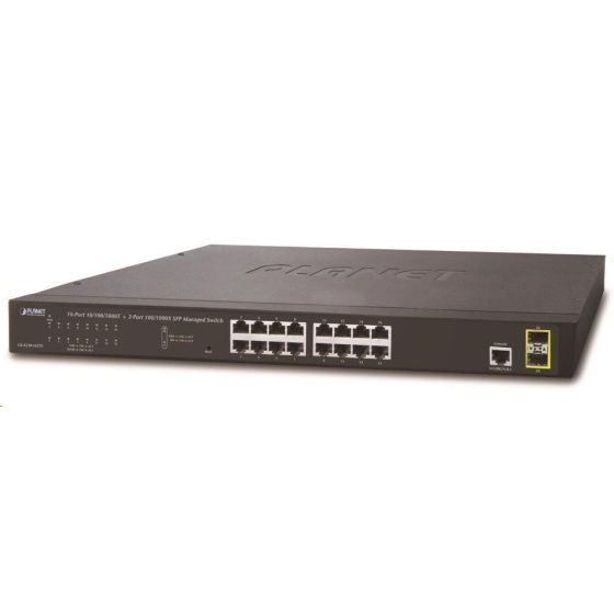 Porty: 16 x RJ-45 10/100/1000BASE-T, 2 x SFP 100/1000BASE-SX, 1 x RJ-45 sériový port konzole