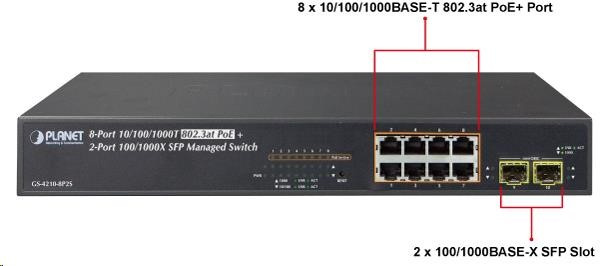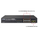 Popis Planet GS-4210-8P2S PoE+ switch 8x 10/100/1000Base-T, 2x SFP, 802.3at do 120W, VLAN, SNMP/WEB