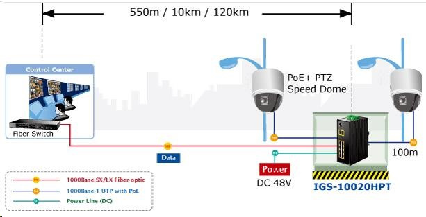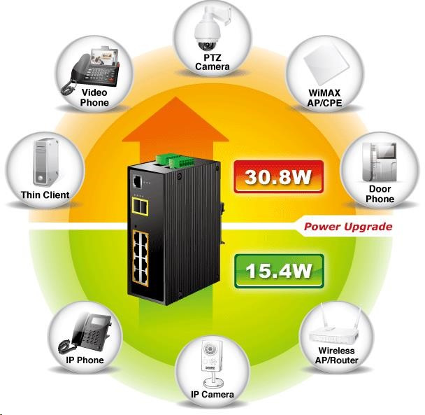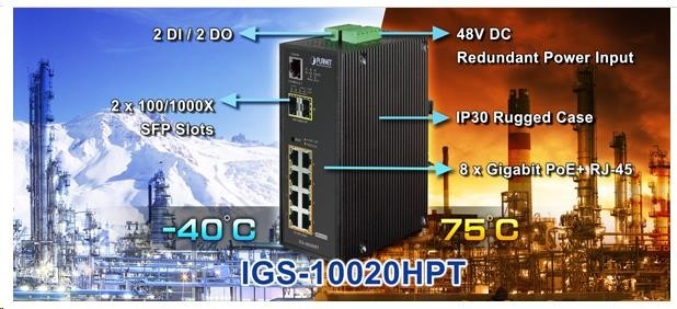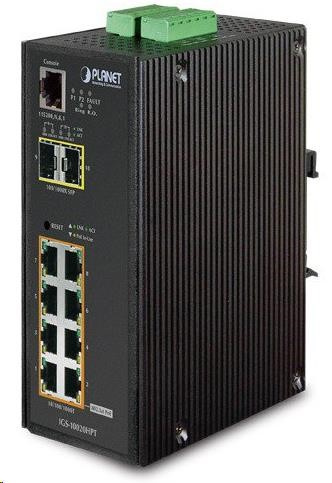 Popis Planet IGS-10020HPT PoE switch 8x 1000Base-T, 2x SFP, 802.3at 270W, IP30, -40 až 75°C, SNMP, IGMPv3, IPv6