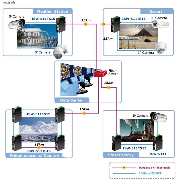 Popis Planet ISW-511T, 4x 10/100Base-TX+ 1x 100FX 2km, MM, DIN, IP30, -40~75°C