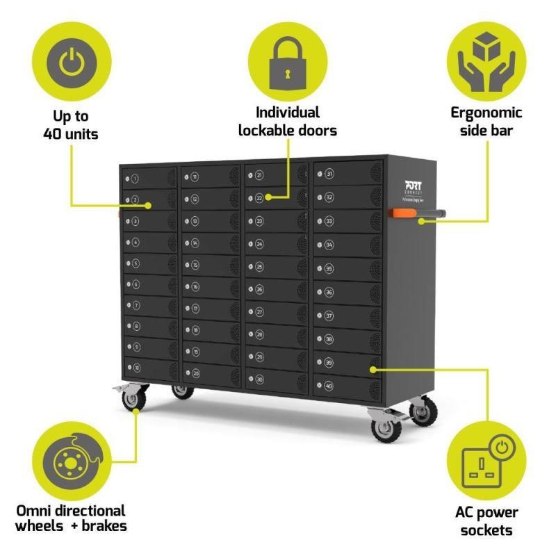 Tento cabinet dokáže nabíjet, bezpečně ukládat a spravovat až 40 tabletů, notebooků, mobilních telefonů a dalších elektronických zařízení.