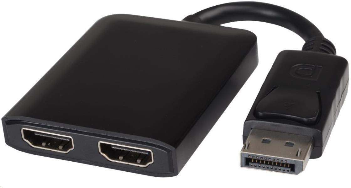 PremiumCord adaptér DisplayPort - 2x HDMI, MST, rozšíření+zrcadlení+2 obrazy, 4K*2K@30Hz Tento adaptér umožňuje propojit DisplayPort výstup se dvěmi HDMI monitory a na každém zobrazovat jiný obraz.Například se dá využít k vytvoření rozšířené plochy na dvou monitorech viz fotografie v příloze jako příklad použití. - Podporuje MST (multi stream transport) , přenos dvou obrazů přes jeden DP konektor - Použitelné rozlišení DisplayPort: FULL HD 1080p, 4K*2K@30Hz - Adaptér MST umožňuje použití tří módů: 1.Přenos dvou různých obrazů na dva monitory 2.Rozšíření jednoho obrazu na dvě obrazovky 3.Zobrazení dvou stejných obrazů na dvou monitorech - Vstupní konektor: DisplayPort (Male) - Výstupní konektory: 2x HDMI (Female) - Standard: DisplayPort 1.2 - Napájení z DisplayPort sběrnice, na zadní straně adaptéru je pro případ nedostatečného napájení z DisplayPort sběrnice přídavný micro USB konektor, přes který je možno připojit přídavné napájení z USB 5V. - Nepotřebuje SW - Pouzdro: plastové - Barva: černá - Délka kabelu: 20cm.