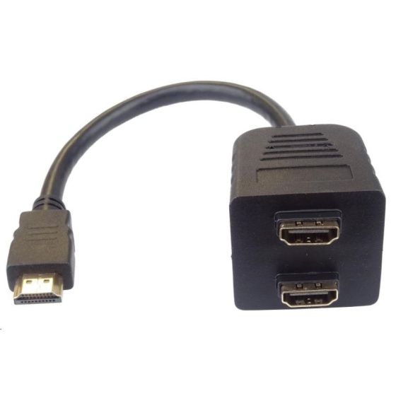 Adaptér HDMI A/M - 2x HDMI A/F Rozdvojka videosignálu z HDMI rozhraní (například z grafické karty) na dva HDMI konektory, ke kterým lze připojit zobrazovače jako jsou například LCD displeje a televizory. Délka redukce je 30 cm, výhodou jsou pozlacené kontakty. Parametry a specifikace: - Vstupní rozhraní: 1x HDMI A (M) 1.3 včetně zvuku - Výstupní rozhraní: 2x HDMI A (F) - Délka kabelu: 30 cm - Barva: Černá Kabel slouží jako rozdvojka na více zařízení, která nesmějí být zapnutá současně..