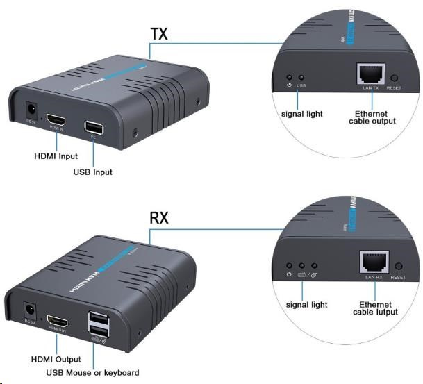 - Vysílač má jeden vstupní HDMI konektor a jeden lokální HDMI výstup. Přijímač má jeden HDMI výstup pro vzdálená monitor.