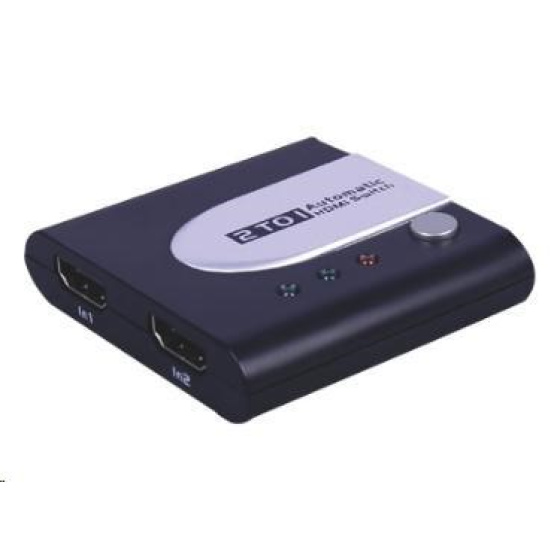 HDMI Switch 2 ->1 automatický 2 HDMI zařízení sdílejí 1 HDMI zařízení (obrazovku). Výběr zařízení je buď automaticky nebo tlačítkem. Podpora 20m HDMI kabelu na vstupu, až 25m HDMI kabelu na výstupu HDMI Switche. Podpora 3D HDMI rolišení 480i, 480p, 720i, 720p,1080i a 1080p Podpora modů VGA,SVGA,XGA,UXGA mode HDMI 1.3b 8bit,10bit,a 12bit barevná hloubka na kanál Výběr vstupu tlačítkem / automaticky. Plug-and-play, není třeba software. - HDCP kompatibilní V balení: 1x HDMI switch 1x 0.5m propojovací HDMI kabel.
