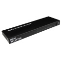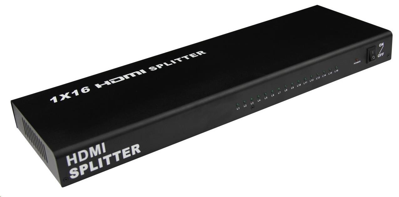 HDMI Video Splitter 1 => 16 s externím napájecím zdrojem, HDMI 1.4a kompatibilní max. rozlišení 1080i a 1080p. Můžete připojit několik HDMI obrazovek k jednomu HDMI zdroji signálu. - kompatibilní s DTV 480i, 480p, 720i, 720p, 1080i and 1080p - podpora VGA, SVGA, XGA a UXGA - HDMI 1.4a - podporuje Full 3D - HDCP ready - indikace stavu LED diodami - napájecí adaptér na 230V v sadě - přenáší obraz i zvuk - podpora až 15m HDMI kabelu na vstupu a 25m HDMI kabelu na výstupu. (zesiluje HDMI signál) - kovové pouzdro pro lepší odvod tepla Pokud se obraz po zapojení rozbočovače nezobrazí ihned po zapojení, vyčkejte cca 30s než dojde k rozpoznání signálu..