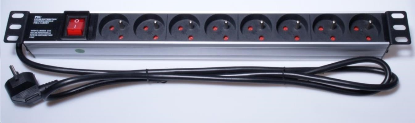 PremiumCord Panel napájecí 1U do 19" racku, 8x230V, 2m kabel, vypínač - horizontální pro montáž do 19" Racku - výška 1U - 8x 230V zásuvka - maximální proud: 16A - UTE zásuvky - 1.5mm2 průřez kabelu - délka kabelu 2m - rozměry : šířka s pevnými úchyty: 485mm, výška: 40mm, hloubka: 44mm - stříbrné hliníkové provedení - vypínač - pracovní teplota: 0-40°C - napájecí panel obsahuje sáček s kompletní sadou šroubů pro instalaci do 19' racku.