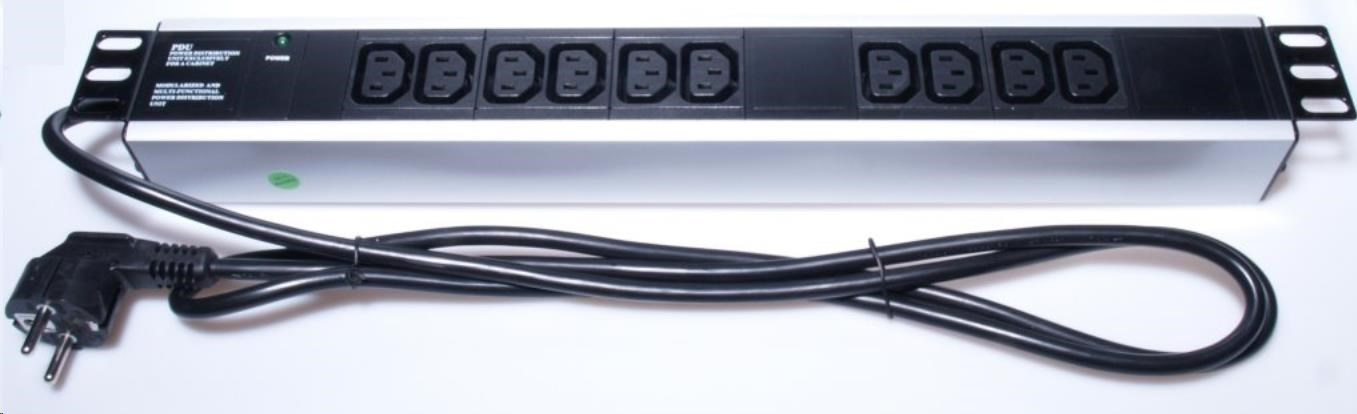 Panel napájecí do 19" racku, 10xIEC (C13), 2m kabel s konektorem do standardní české zásuvky - provedení z eloxovaného hliníku - horizontální pro montáž do 19" Racku - výška 1,5U - 10x IEC (C13) 230V zásuvka - maximální proud: 16A - IEC (C13) zásuvky - 1.5mm2 průřez kabelu - délka kabelu 2m s konektorem do standardní české zásuvky - rozměry : šířka s pevnými úchyty: 485mm, výška: 61mm, hloubka: 44mm - pracovní teplota: 0-40°C - napájecí panel obsahuje sáček s kompletní sadou šroubů pro instalaci do 19' racku.