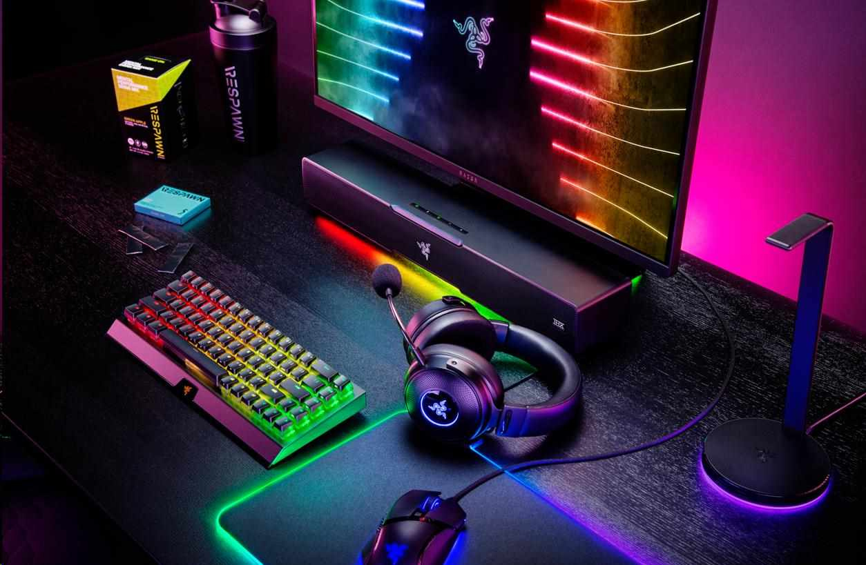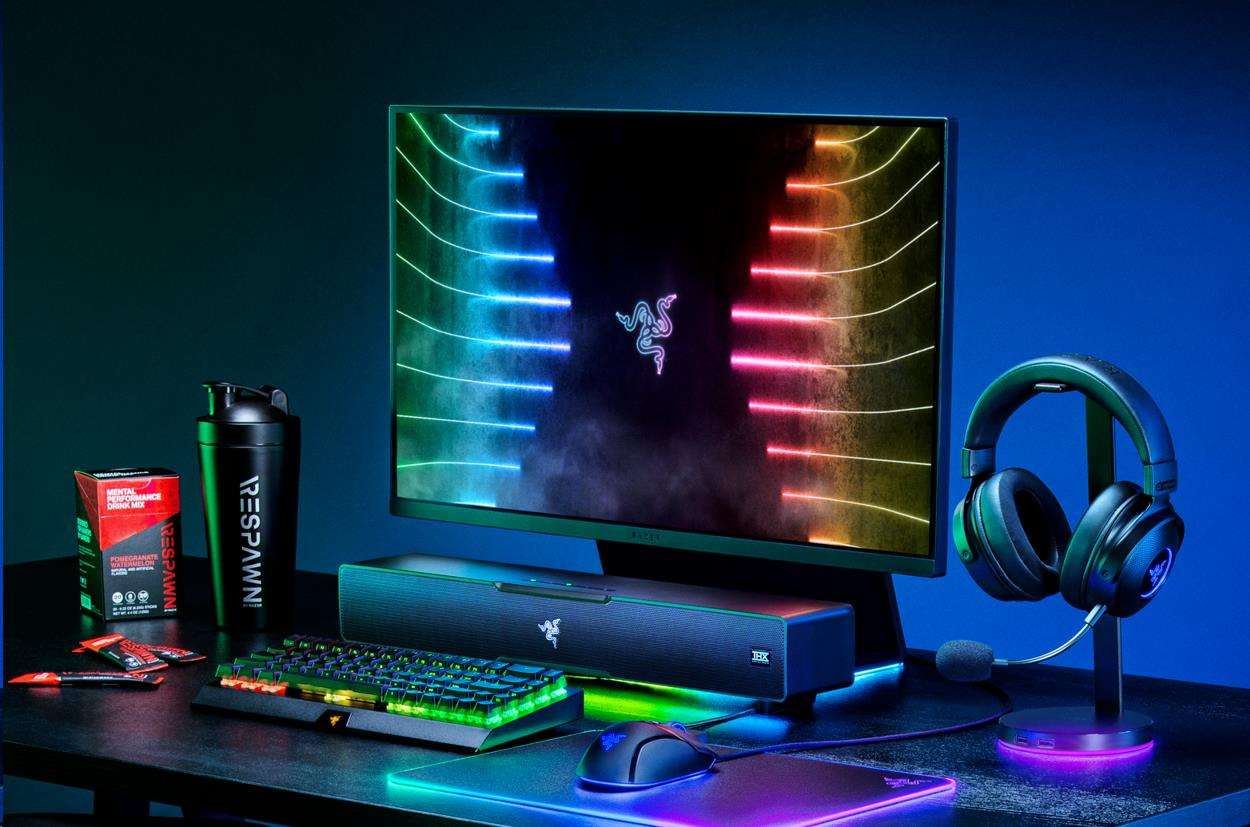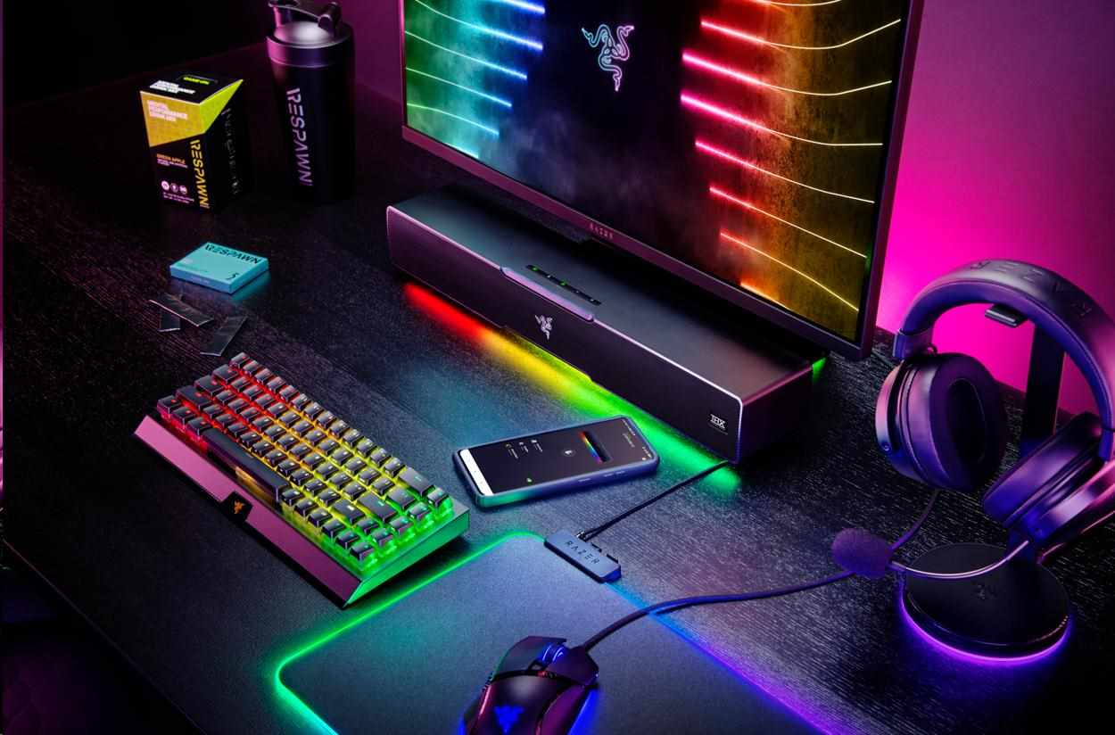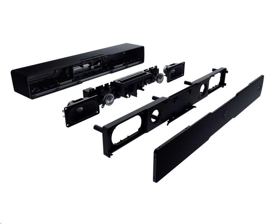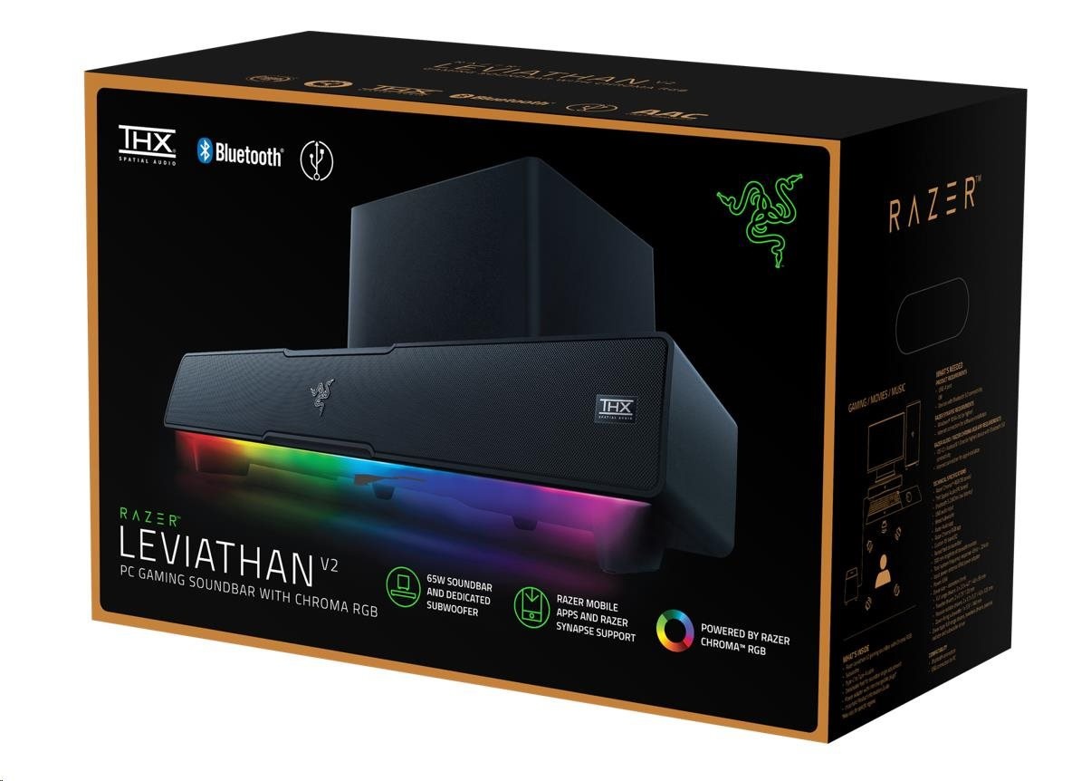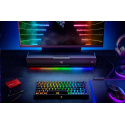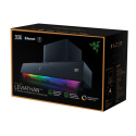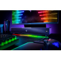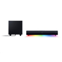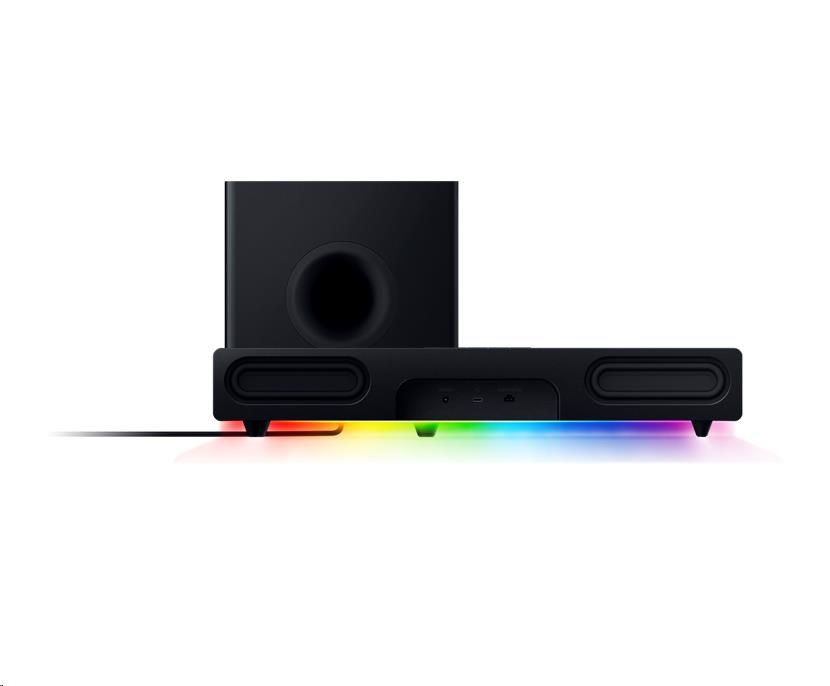 | OTHERS | Razer Chroma™ RGB (18 zones) THX Spatial Audio (PC based via Synapse 3) Bluetooth 5.2 (60ms low latency) USB audio input Razer Audio app Razer Chroma RGB app Custom 10-band EQ Raised feet on soundbar Headphone quick toggle Dimensions: Soundbar: 19.7 x 3.6 x 3.3" / 500 x 91.3 x 84 mm Subwoofer: 8.67 x 8.67 x 9.5" / 220 x 220 x 241.5 mm |
