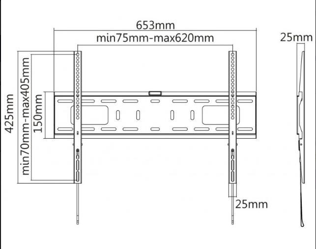 Nástěnný ocelový držák na Plasma a LCD TV s uhlopříčkou 37"- 70" (94-178cm) a hmotností maximálně 50kg. Konzole na zavěšení TV s vodováhou, není vertikálně výklopný, vzdálenost od stěny 25mm, materiál ocel, cenově výhodné, barva černá. Uchycení VESA: 200x200, 400x200, 300x300, 400x400, 600x400..