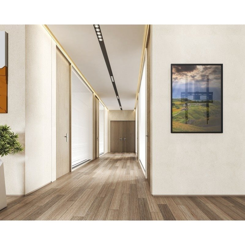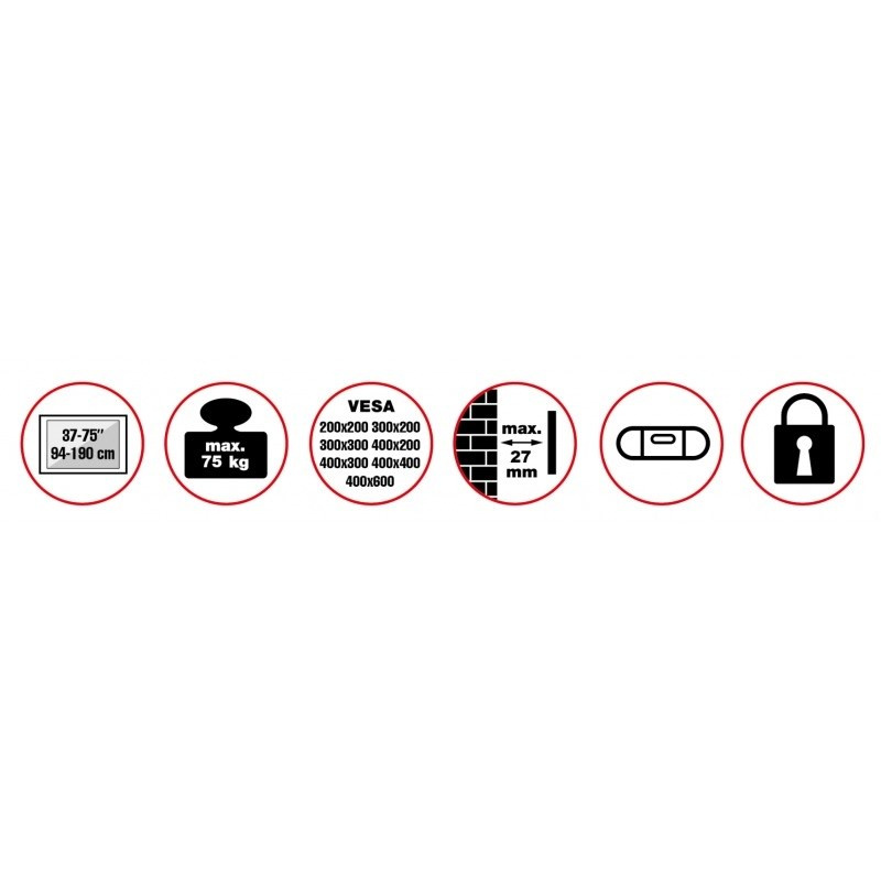 Nástěnný ocelový držák na velké televizory s uhlopříčkou 37"- 75" (94-190cm) a hmotností maximálně 75kg. Konzole na zavěšení TV s upevněnými držáky vertikálně, VESA max 400x600, není výklopný, vzdálenost od stěny 27mm, rozměry 44,8x62,5x2,7cm, barva černá. Uchycení VESA: 200x200, 300x200, 300x300, 400x200, 400x300, 400x400, 400x600..