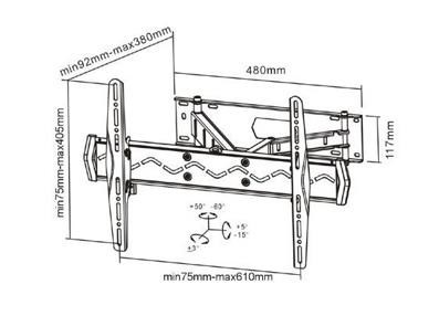 Nástěnný ocelový držák s bočním natáčením na Plazma a LCD TV s uhlopříčkou 37"- 70" (94-178cm) a hmotností maximálně 50kg. Uchycení VESA: 200x200, 400x200, 300x300, 400x400, 600x400. Popis: 3x pant, vertikálně výklopný +10°/-20° a horizontálně otočný +90°/-90°, vzdálenost od stěny 62-475mm, vodováha, materiál ocel, barva černá..