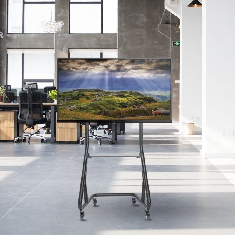 Televizní stolek na velké TV s uhlopříčkou 60"- 105" (152-267cm) a hmotností maximálně 100kg. Trubkový nosný profil 168,5cm na kolečkách s aretací, fixní držák s možností zamčení, police 28x33cm max 25kg, Cable managment, rozměry 109x68x168,5cm, materiál alu/ocel, barva černá. Uchycení VESA: 400x400, 600x400, 800x400, 800x600, 1000x600..