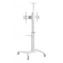 Televizní stolek na velké LCD TV s uhlopříčkou 37"- 70" (94-178cm) a hmotností maximálně 50kg. Středový nosný profil 125-160cm na kolečkách s aretací, držák výklopný +5°/-12°, horní výškově nastavitelná otočná plocha pro kameru max 5kg , polička 34x46cm max 5kg, Alu/ocel, barva bílá. Uchycení VESA: 200x200, 300x300, 400x200, 400x400, 600x400..