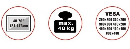Unikátní televizní stolek na Plasma a LCD TV s uhlopříčkou 49"- 70" (124-178cm) a hmotností maximálně 40kg. Designová kombinace kové konstrukce + 4x dřevěné nohy (ořech). Propracované tvary a vedení kabeláže pro maximální estetický zážitek. Uchycení VESA: 200x200, 300x200, 300x300, 400x200, 400x400, 600x400..