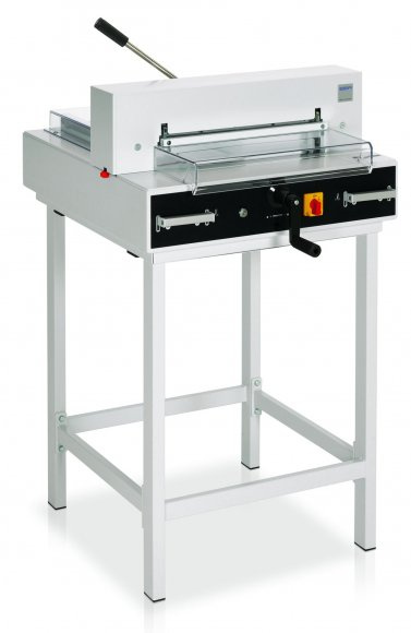Pohodlné a přesné řezání do formátu A3, délka řezu 430 mm, elektromechanický pohon nože a digitální zobrazení míry zadního dorazu. Hloubka vložení stohu 435 mm, výška stohu 40 mm. Made in Germany. Bezpečnostní vybavení: spuštění řezu oběma rukama elektronicky jištěný, transparentní bezpečnostní kryt na předním stole transparentní bezpečnostní kryt na zadním stole automatický zpětný chod nože z každé pozice hlavní vypínač a bezpečnostní zámek s klíčkem snadná a bezpečná výměna nože z přední strany bez nutnosti sundání krytů řezačky pomůcka pro výměnu nože s ochranným krytem ostří nastavení hloubky zářezu nože (z venku) jednoduché otočení / výměna řezací lišty (z venku) Základní vybavení řezačky: elektromechanický pohon nože manuální rychlý pákový lis vřetenový posuv dorazu (ruční klikou) digitální zobrazení míry zadního dorazu (mm/palce) přesný zadní doraz optické vyznačení místa řezu nůž z kvalitní oceli Solingen nastavitelná hloubka zářezu nože standardně dodáváno jako stolní zařízení volitelné příslušenství – podstava (doporučujeme) nebo skříňka.