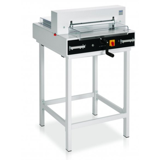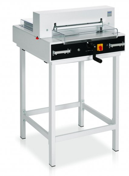 Pohodlné řezání do formátu A3, automatický lis, délka řezu 430 mm, hloubka vložení stohu 435 mm, výška stohu 40 mm. ZÁKLADNÍ VYBAVENÍ ŘEZAČKY: elektromechanický pohon nože a lisu optické vyznačení místa řezu nůž z kvalitní oceli automatický lis vřetenový posuv dorazu pomocí ruční kliky digitální zobrazení míry zadního dorazu (cm/palce) přesný zadní doraz precisní boční doraz nastavitelné vedení nože lze dodat jako stolní zařízení, volitelné příslušenství – podstava nebo skříňka BEZPEČNOSTNÍ VYBAVENÍ: spuštění řezu oběma rukama elektronicky jištěný, transparentní bezpečnostní kryt na předním stole transparentní bezpečnostní kryt na zadním stole automatický zpětný chod nože a lisu z každé pozice brzda pro okamžité zastavení nože hlavní vypínač a bezpečnostní zámek s klíčkem pomůcka pro výměnu nože s ochranným krytem ostří nastavení hloubky zářezu nože (z venku) snadná a bezpečná výměna nože z přední strany bez nutnosti sundání krytů řezačky jednoduché otočení / výměna řezací lišty (z venku) dřevěný doraz.