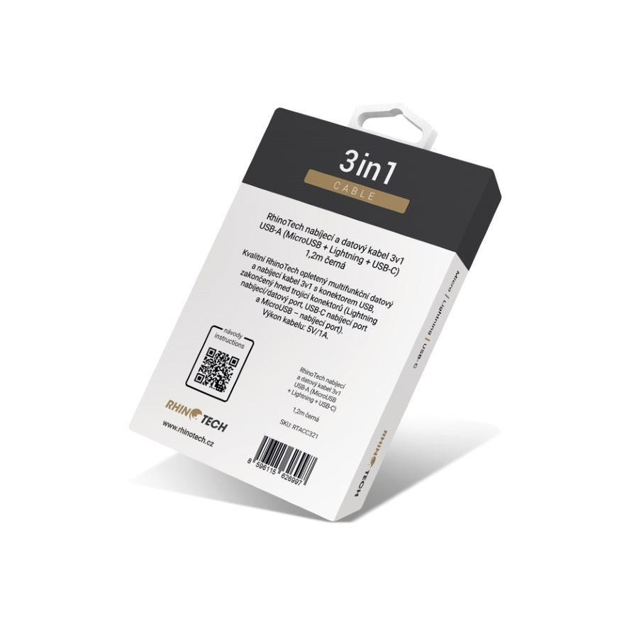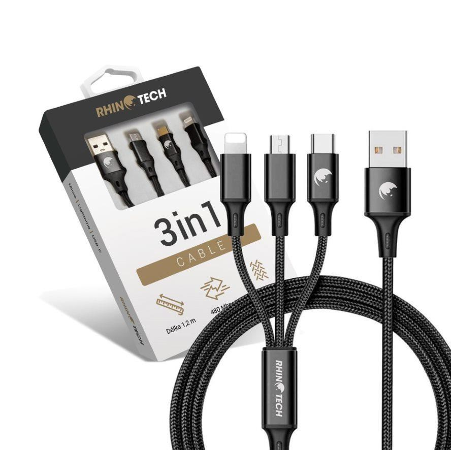 Kvalitní RhinoTech opletený multifunkční datový a nabíjecí kabel 3v1 s konektorem USB, zakončený hned trojicí konektorů (Lightning nabíjecí/datový port, USB-C nabíjecí port a MicroUSB – nabíjecí port).