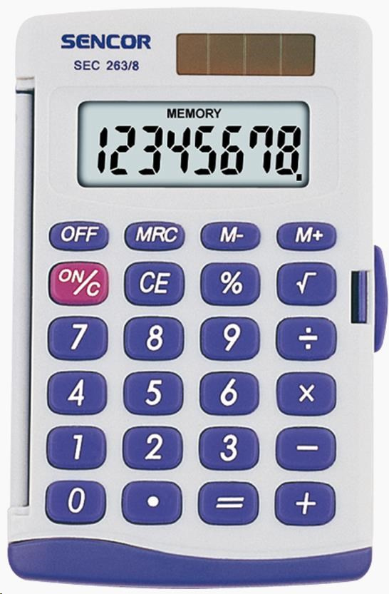 Kapesní kalkulačka s pevným plastovým krytem Přehledný 8mi místný displej Výpočet procent a odmocniny Oprava zadání, 3 tlačítková paměť Napájení: Duální solár/bateriové Rozměry: 10 x 60 x 94 mm, hmotnost: 35 g EAN 8590669044900.