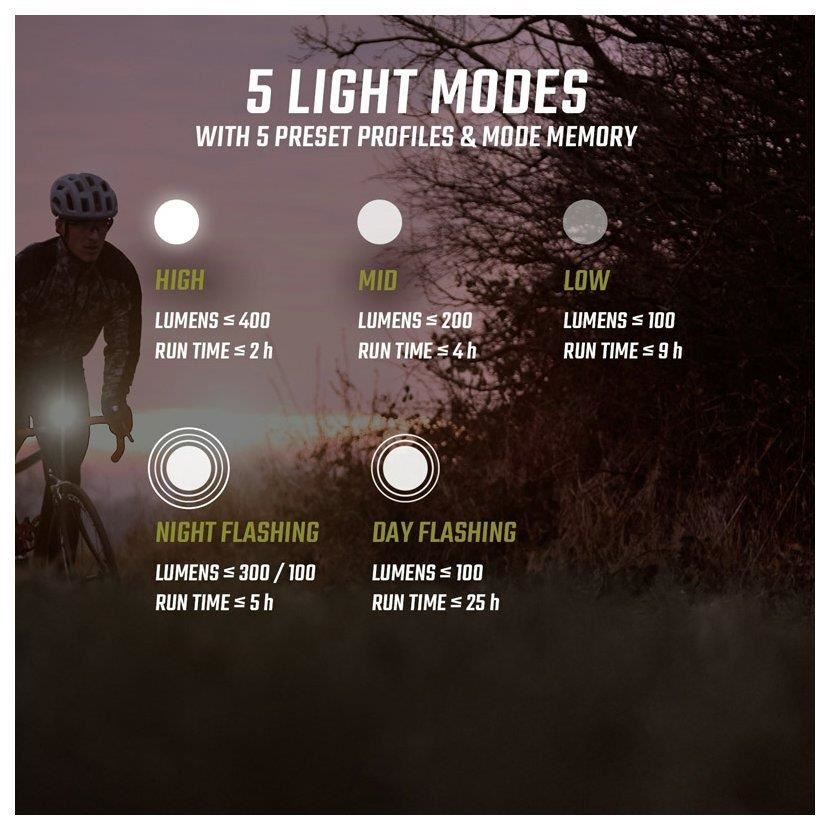 Někdy potřebujete na temných cestách plný výkon světla, jindy stačí být pouze viděn, s Buster 400 se vždy přizpůsobíte každé situaci. Máte na výběr z pěti světelných režimů, pomocí kterých můžete individuálně ovlivnit intenzitu osvětlení a dobu výdrže baterie. V režimu High dosahuje světlo Buster 400 světelného výkonu 400 lumenů po dobu až 2 hodin, v režimu Mid svítí až 4 hodiny při světelném výkonu 200 lumenů. A kdyby se náhodou vyjížďka protáhla, vydrží v režimu Low spolehlivě svítit až 9 hodin. S režimem blikání Night Flashing jste viditelní až 5 hodin, Day Flashing pak zajistí dobrou viditelnost po dobu až 30 hodin.