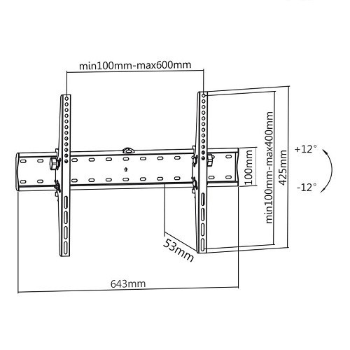 Kvalitní ocelový nástěnný držák pro zavěšení televizí s úhlopříčkou 37-70" a nastavení náklonu od +12° až do -12°, vzdálenost Tv od zdi 53mm, VESA 100x100 až 600x400, nosnost 40kg, instalační materiál, záruka 5 let.Více