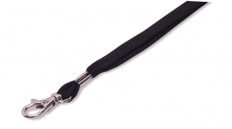 Dutá šňůrka s karabinkou černé barvy. Šířka sňůrky 12 mm, délka 90 cm. Balení 50 ks..