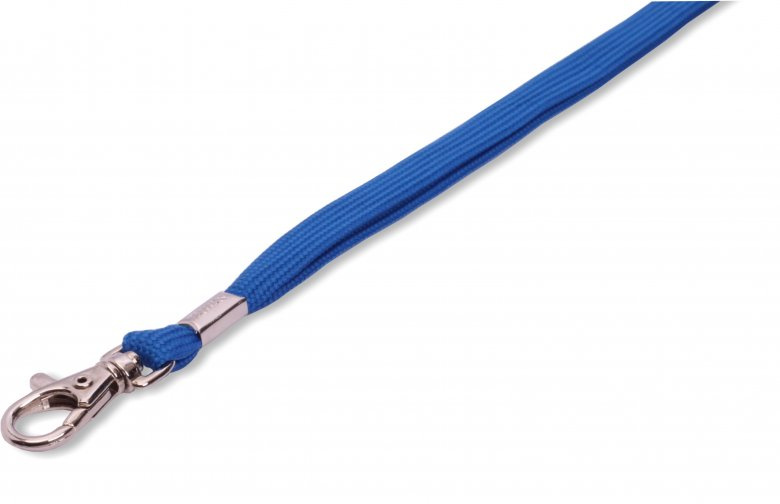 Dutá šňůrka s karabinkou modré barvy. Šířka sňůrky 12 mm, délka 90 cm..
