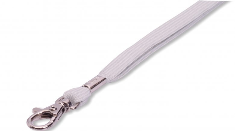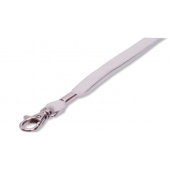 Dutá šňůrka s karabinkou šedé barvy. Šířka sňůrky 12 mm, délka 90 cm..