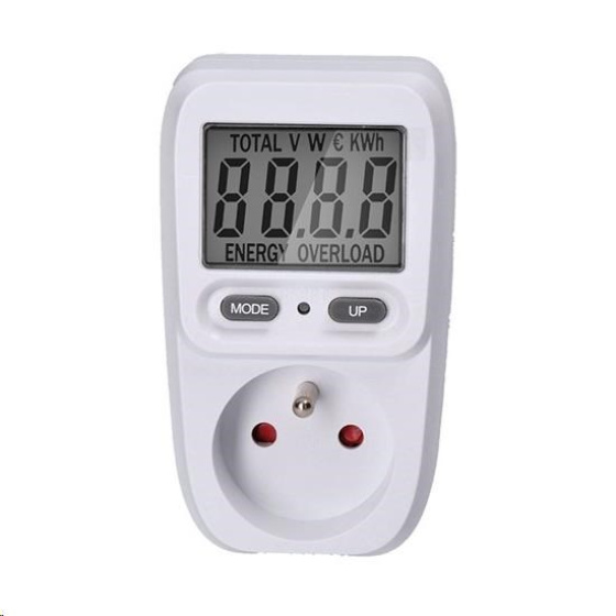 přehledný LCD displej, úhlopříčka 2" - 5cm max. měřená spotřeba: 9999kWh min. množství zaznamenávaného příkonu: 2W, max.: 3680W/16A nastavení ceny za energii 2 tlačítka pro jednoduchou obsluhu přesný výpočet ceny a měření spotřebované energie dětská pojistka indikace překročení max. příkonu "overload" měření elektrických veličin: napětí, okamžitý odebíraný výkon integrovaný stabilizátor napětí až do +- 1,5% odchylky od jmenovitého napětí pro přesné měření pracovní teplota: 0 až + 50°C napájení: AC 230V, 50Hz.