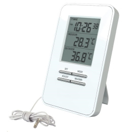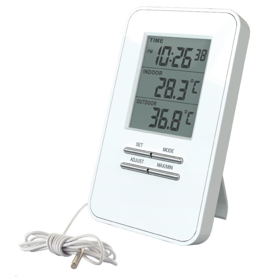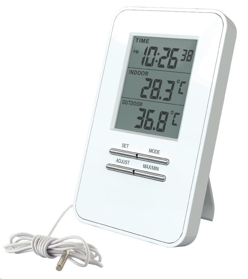 Měření vnitřní teploty: -10°C až +50°C, měření venkovní teploty: -40°C až +70°C, paměť minimálních a maximálních teplot, čas, budík, délka kabelu se senzorem: 1,5m, barva: bílá, napájení: 2 x LR1130 baterie (součástí balení).Více