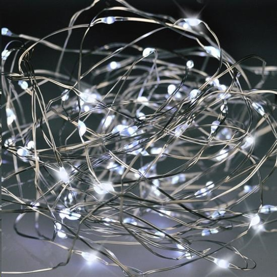 LED řetěz se stříbrný drátkem počet LED diod: 100 barva světla: studená bílá napájení: 3x AA baterie (nejsou součástí) výdrž baterií: cca 100hod. (v závislosti na kvalitě baterií) třída ochrany: IP20 (vnitřní použití) délka: 10m barva: stříbrná balení: PVC krabice.
