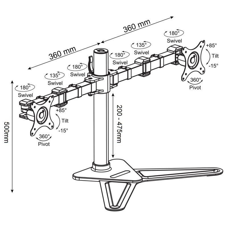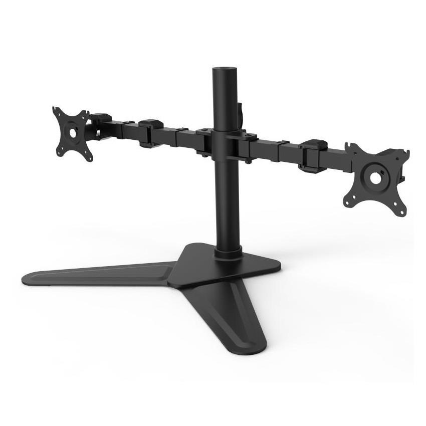 Stolový držák na 2 monitory ErgoSolid NF22LG Stolní držák s podstavou na 2 monitory 15-32", otáčení do stran, náklon, délkové a výškové nastavení, funkce pivot, barva černá, záruka 3 roky Kvalitní a designově velmi pěkný plně polohovatelný stolní držák pro zavěšení 2 monitorů. Stabilní podstavec, bez nutnosti kotvení do stolu. 2 nezávislá ramena umožňují nastavení polohy každého monitoru dle Vaší potřeby - otáčení do stran, náklon, nastavení vzdálenosti od podstavy, nastavení výšky monitoru od stolu, funkce pivot. Barevné provedení černé. Záruka 3 roky. Stolový držák na 2 monitory nebo notebooky - ErgoSolid NF22 Technické údaje: nosnost 20kg (2x10kg) zavěšení 2 monitorů s úhlopříčkami 15-32" podpora VESA standandardu 75x75 a 100x100 nezávislé otáčení monitorů do stran +/- 90° nezávislé naklopení monitorů +85° / -15° funkce pivot - nezávislé otočení monitoru na šířku nebo na výšku korekce roviny monitorů snadné nastavení výšky monitoru od stolové desky 200-475mm délka ramene 360mm, 3 klouby stabilní postava - bez kotvení do stolové desky výborná kvalita barevné provedení černé záruka 3 roky Stolový držák na 2 monitory podporuje VESA standardy: VESA 75x75 VESA 100x100.