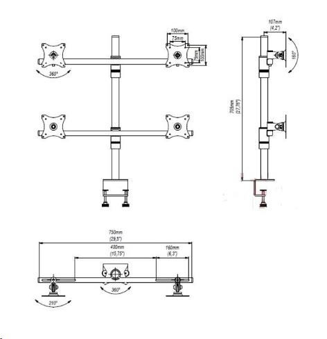Technické údaje: maximální celkové zatížení 40kg na monitory s úhlopříčkou až 30" podporuje VESA standard 75x75 a 100x100 posun monitoru po ose držáku nastavitelná výška obou sad monitorů náklon monitoru až 160st. otáčení do stran až 70st. funce pivot - horizontální i vertikální natočení obrazovky dodáváme včetně 2 typů uchycení na stolovou desku uchycení na stolovou desku o síle 10-70mm barva stříbrná nebo černá záruka 5 let Profesionální stolní držáky na 4 monitory EDBAK podporují VESA standardy: VESA 75x75 VESA 100x100 možnost dokoupení VESA 200x100 možnost dokoupení VESA 200x200.