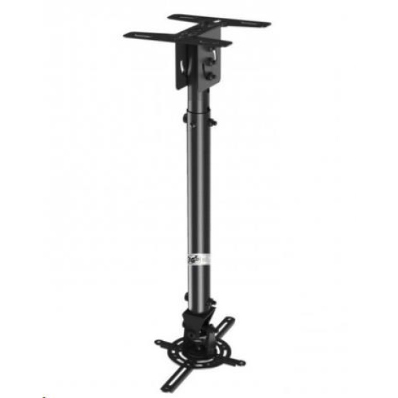 Stropní držák na projektory Fiber Mounts T718-2 černý Držák na projektory, univerzální, otočný, sklopný, délkové nastavení, barva černá Kvalitní stropní držák pro zavěšení všech typů projektorů s hmotností do 13,6kg. Plná nastavitelnost polohy projektoru - nastavení vzdálenosti od stropu 53÷83cm, otáčení do stran, náklon v obou osách, možnost uchycení i na šikmé stropy. Vynikající kvalita, pěkný design. Barevné provedení černé. Fiber Mounts NBT718-2 stropní držák na projektory v černém provedení, otočný, sklopný, délkově nastavitelný, i na šikmé stropy, TOP kvalita Technické údaje: max. zatížení 13,6kg na všechny typy projektorů s podporou zavěšení nastavitelná vzdálenost od stropu 530-830mm náklon +20° až -20° otáčení do stran +60° až -60° korekce roviny projektoru +20° až -20° možnost přetočení úchytu z vodorovné pozice do svislé podporuje 3-bodové i 4-bodové zavěšení projektoru profesionální kvalita snadná nastavitelnost montážní materiál součástí balení krásný design barva černá záruka 5 let.