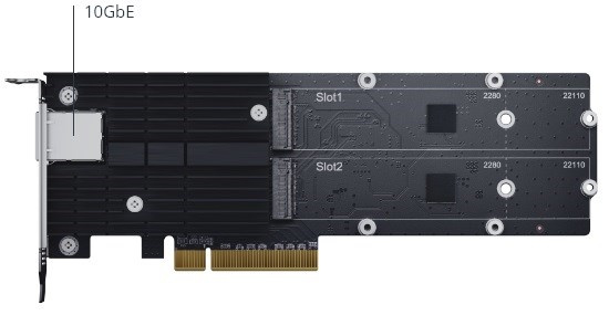 Akční nabídky na váš e-mailšířka pásma 10GbE a mezipaměť M.2 SSD – všechno pohromadě Adaptér Synology E10M20-T1 pomáhá současně zvyšovat výkon vstupu/výstupu i šířky pásma s využitím jediného rozšiřovacího slotu PCIe vašeho zařízení Synology NAS.