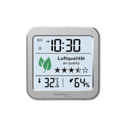 Měřič kvality vzduchu Vám pomůže při analýze a vyhodnocení kvality vzduchu v místnosti. Integrovaný snímač kvality vzduchu nepřetržitě monitoruje klima v místnosti, analyzuje koncentraci znečišťujících látek a na základě zjištěných hodnot poskytne doporučení k vyvětrání místnosti. Měření probíhá pomocí výkonného senzoru souhrnu těkavých organických látek (TVOC) a CO2. Koncentrace CO2 je dobrým indikátorem vydýchaného vzduchu. Ve vydechovaném vzduchu ve vnitřním prostředí je koncentrace CO2 zhruba 50 x vyšší než je ve vdechovaném vzduchu. Pro doporučení větrání se využívá toho, že pokud stoupá koncentrace CO2, tak stoupá i koncentrace těkavých organických látek (VOC). Když se začne větrat na základě zvýšené koncentrace CO2, tak klesne koncentrace jak CO2, tak i koncentrace VOC a cítíme se lépe. Senzor CO2 měřiče kvality vzduchu WL 1020 nedetekuje obsah CO2 přímo v prostředí, ale přibližnou hodnotou odvozenou od jiných příslušných parametrů senzoru. Ve vnitřních podmínkách se vzduch v místnosti skládá z přibližně 78 % dusíku, přibližně 21 % kyslíku, přibližně 1 % ušlechtilých plynů a přibližně 0,03 % oxidu uhličitého. Koncentrace vzácných plynů a oxidu uhličitého jsou rozhodující pro hodnocení kvality vnitřního ovzduší a jejího vlivu na naši pohodu a zdraví. Kvalita vzduchu je označena 5 hvězdičkami v 11 úrovních. Čím více symbolů hvězd je zobrazeno, tím lepší je naměřená kvalita vzduchu. Při napájení USB adaptérem (adaptér není součástí balení) je senzor kvality vzduchu stále zapnut, probíhá měření a doporučení větrání je indikováno žlutým osvětlením a důrazné doporučení větrání podsvícení červeným osvětlením displeje. Bílé osvětlení indikuje dobrou kvalitu vzduchu. Při napájení pouze bateriemi je osvětlení displeje vypnuto, je zobrazen čas, teplota, relativní vlhkost a poslední měření kvality vzduchu. Pro obnovu měření kvality vzduchu je třeba manuálně aktivovat senzor kvality vzduchu, zobrazí se hodnocení pomocí hvězdiček a z důvodu úspory baterií se po 5 minutách měření vypne a na displeji zůstane výsledek posledního měření. ? LCD displej o rozměrech 58 x 65 mm ? velikost číslic na displeji – čas 14 mm, teplota a relativní vlhkost 10 mm ? zobrazení kvality vzduchu pomocí 5 hvězdiček v 11 úrovních a barvou osvětlení displeje (bílá, žlutá, červená - při napájení USB adaptérem) ? možnost obnovení tovární kalibrace ? měření teploty a relativní vlhkosti ? zobrazení teploty ve C, nebo F ? paměť na maximální a minimální naměřené hodnoty teploty a rel. vlhkosti ? čas ve formátu 12, nebo 24 hodin ? budík s funkcí opakovaného buzení po 5 minutách (Snooze) ? budísí signál - 4 pípnutí za sekundu ? 3 stupně jasu osvětlení, nebo vypnutí osvětlení displeje (při napájení USB adaptérem) ? ikona slabých baterií ? barva bílá se stříbrným rámečkem ? napájení pomocí baterií (2 ks typ AAA-mikrotužkové), nebo USB adaptérem (nejsou součástí balení) ? možnost postavení, při napájení pouze bateriemi i zavěšení Obsah balení ? měřič kvality ovzduší ? USB kabel ? český, německý, anglický TECHNICKÉ PARAMETRY Detekce CO2 ano, od 400 do 9999 ppm Metoda měření CO2 nedetekuje CO2 přímo v prostředí, ale příslušnou hodnotu odvozenou od jiných parametrů Detekce TVOC ano, od 0 do 9,999 mg/m3 Indikace kvality vzduchu 5 hvězdičkami v 11 úrovních, barvou osvětlení displeje (bílá, žlutá, červená - při napájení USB adaptérem) Rozsah měření vnitřní teploty / tolerance -9,9°C až +50°C ±1°C Rozlišení vnitřní teploty 0,1°C Rozsah měření vnitřní rel. vlhkosti / tolerance 10% až 95% ±5% Rozlišení vnitřní rel. vlhkosti 1% Paměť na max a min naměřené hodnoty ano, teploty a relativní vlhkosti Čas ano, manuálně nastavitelný Formát času 12 / 24 hpdin Budík ano Opakované buzení (Snooze) ano, po 5 minutách Rozměry displeje hlavní jednotky 64 x 58 mm Velikost číslic - hlavní jednotka čas 19 mm, teplota, relativní vlhkost 10 mm Osvětlení displeje hlavní jednotky ano, při napájení USB adaptérem 3 stupně jasu a možnost vypnutí osvětlení, indikace kvality vzduch změnou barvy osvětlení displeje - bílá, žlutá, červená. Při napájení bateriemi je osvětlení vypnuto. Napájení USB adaptér 5,0 V, 1 A (není součástí balení) 2 ks baterií 1,5 V typ AAA (mikrotužkové, nejsou součástí balení) Celkové rozměry 81 x 81 x 25 mm Hmotnost 98 g (bez baterií) Barva bílá se stříbrným rámečkem Možnost postavení / zavěšení ano / ano, při napájení pouze bateriemi LOGISTICKÉ ÚDAJE Hmotnost celkem (kg) 0.176 Hmotnost výrobku (kg) 0.098 Hmotnost obalu (kg) 0.024 Rozměry obalu (cm) 95 x 94 x 55 Hmotnost kartonu (kg) 8.800.