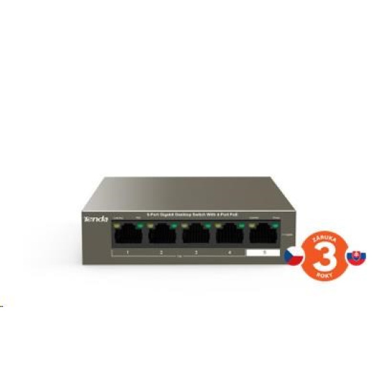 Akční nabídky na váš e-mailTenda TEG1005P-4-63W přepíná data pomocí 5ti portů RJ45 s přenosovou rychlostí 10/100/1000 Mb/s s automatickou detekcí rychlosti. Jeden port slouží pro Uplink a 4 PoE porty podporují PoE 802.3af a 802.3at. Switch podporuje stabilní 8 jádrové PoE napájení, ochrana proti přepětí 6kV. Podpora přepojování uzlů v módu Store-and-Forward. Full-duplex kontrola toku 802.3x, half-duplex kontrola toku v režimu Back-Pressure.