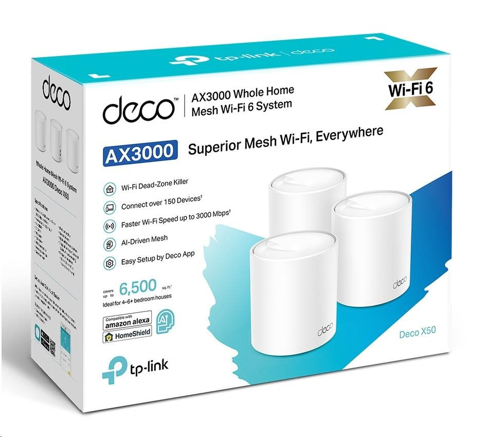 | Package Contents | Deco X50 (1-pack) 1 Deco X50 unit 1 RJ45 Ethernet cable 1 Power adapter 1 Quick Installation Guide Deco X50 (2-pack) 2 Deco X50 units 1 RJ45 Ethernet cable 2 Power adapters 1 Quick Installation Guide Deco X50 (3-pack) 3 Deco X50 units 1 RJ45 Ethernet cable 3 Power adapters 1 Quick Installation Guide |